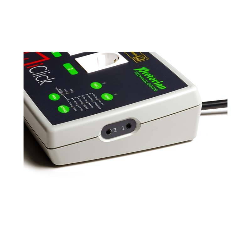 iClick hat über zwei Netzsteckereingänge für Geräte (maximal 10 Ampere gemeinsam) sowie zwei 3,5 mm Klinkensteckeranschlüsse für externe Taster.