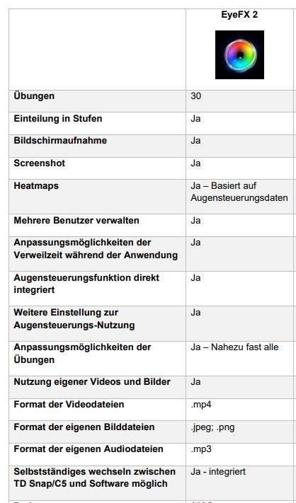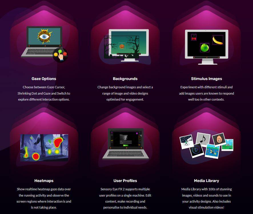 Das Softwarepaket „Sensory Eye FX 2“ bietet insgesamt 30 Aktivitäten, die für den frühen Einsatz der Augensteuerung auf einem niedrigen Beginner-Niveau entwickelt wurden, wie z. B. das Lokalisieren eines Stimulus, das Auswählen eines Stimulus, das Wechseln des Blicks zwischen Stimuli, dem Erkunden mit den Augen und mehr. Die Anwendungen starten bei „einfachen Ursache-Wirkungs-Prinzipien“ und ersten Augensteuerungsaktivitäten, gehen weiter zum „Zielen lernen“ bis hin zum „aktiven Beobachten“ und „kontrolliertem Zielen“.
