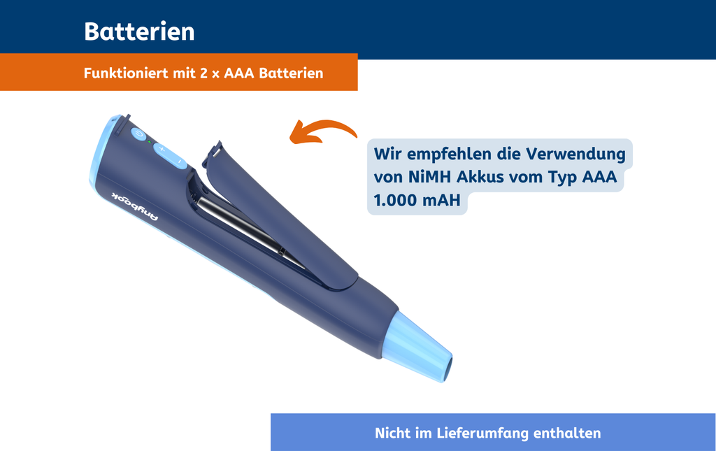 - Batterien: 2 AAA (nicht enthalten) – wir empfehlen die Verwendung von NiMH Akkus vom Typ AAA 1.000 mAH