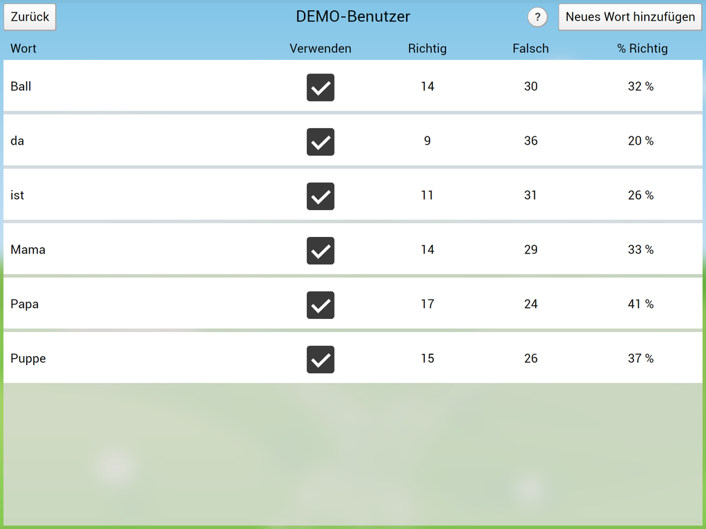 Die App beinhaltet die Basisübung „Wörter lernen“ zum Einführen neuer Wörter und 5 Übungen zum Festigen der erlernten Wörter.