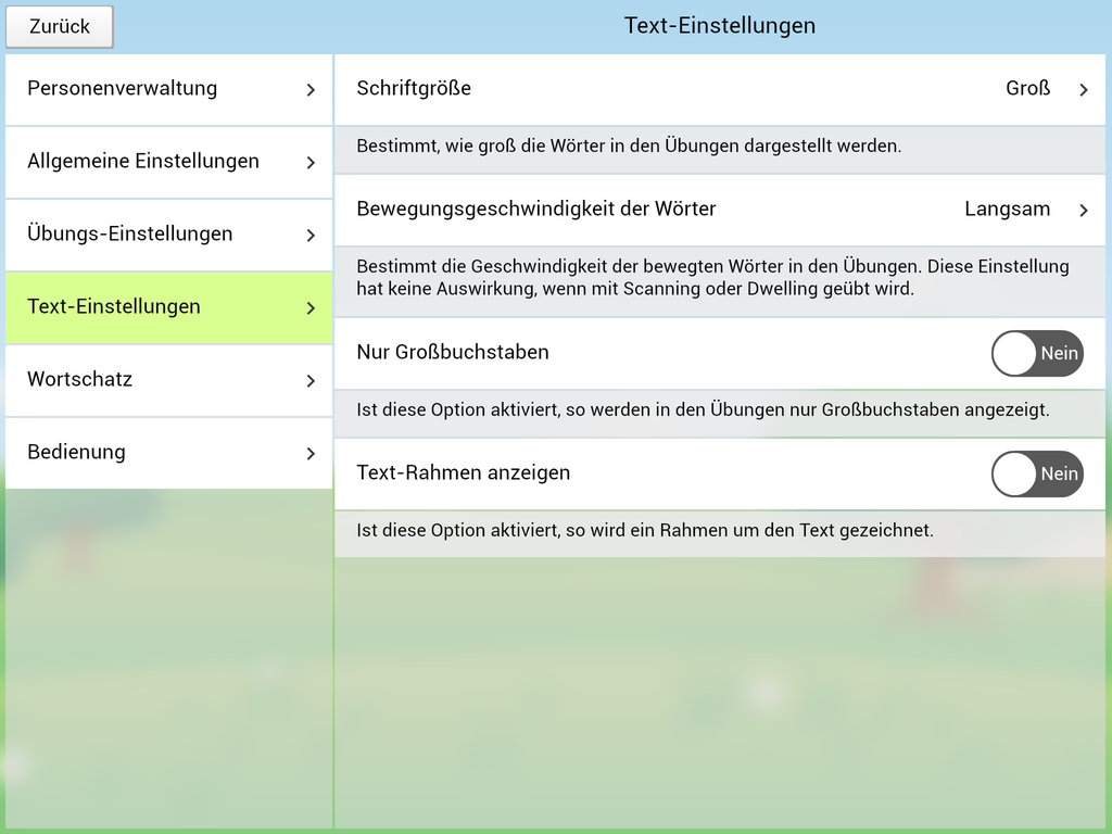 Verschiedene Einstellmöglichkeiten erlauben eine gute Anpassung an die Bedürfnisse der übenden Person. Die Aussprache der Wörter kann beispielsweise auf Deutsch oder Österreichisch eingestellt werden.