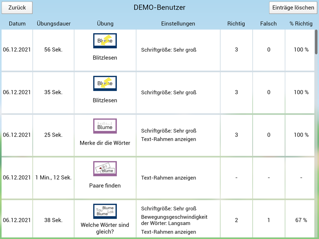 Alle abgeschlossenen Übungen werden protokolliert und so die Überprüfung des Lernfortschritts ermöglicht.