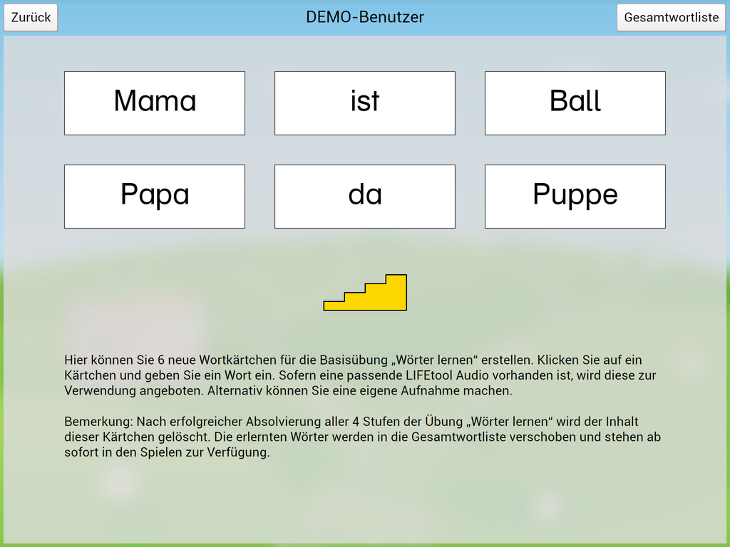Die App beinhaltet die Basisübung „Wörter lernen“ zum Einführen neuer Wörter und 5 Übungen zum Festigen der erlernten Wörter.