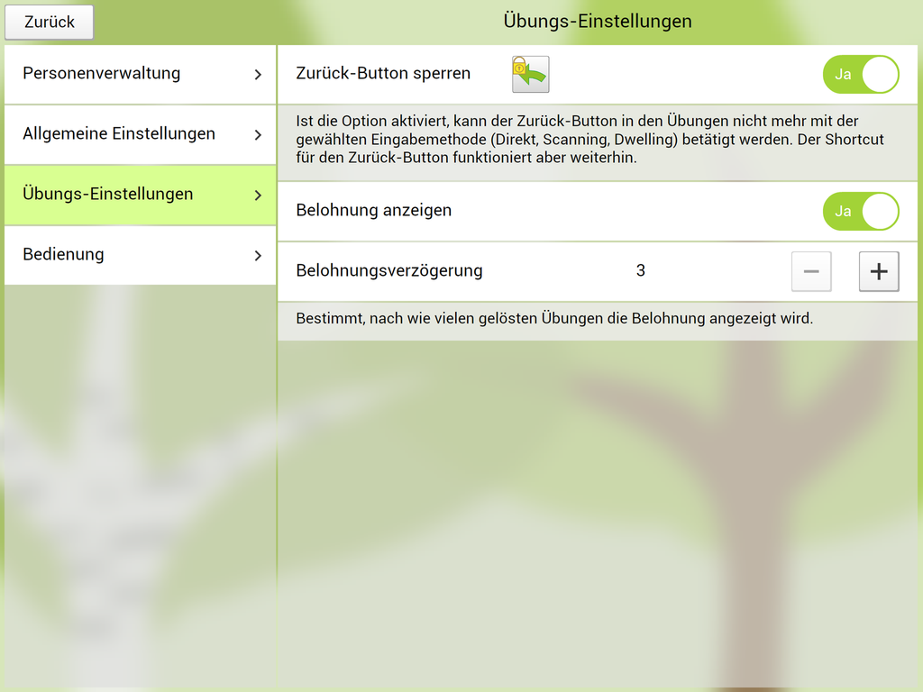 Die App bietet Übungen zu den unterschiedlichen Fertigkeiten in mehreren Schwierigkeitsgraden. Eine einfache Darstellung (Thema Wald) unterstützt die Konzentration auf das Wesentliche. Auf zu kindliche Gestaltung wurde bewusst verzichtet, um auch für ältere Kinder und Jugendliche ansprechend zu sein.