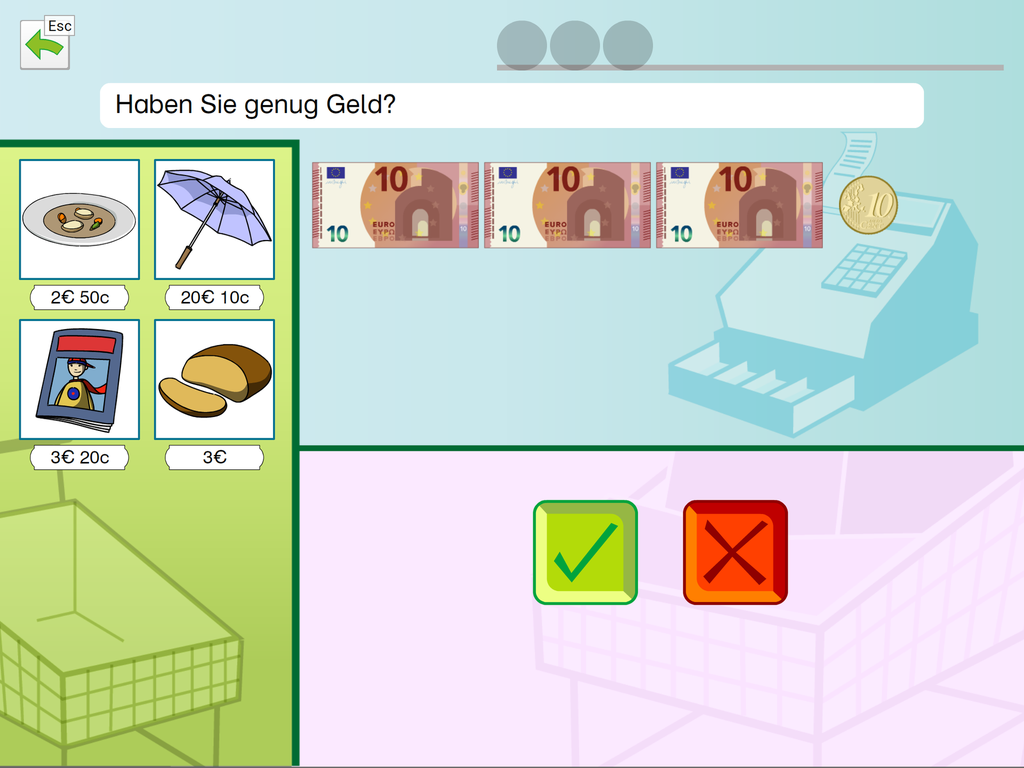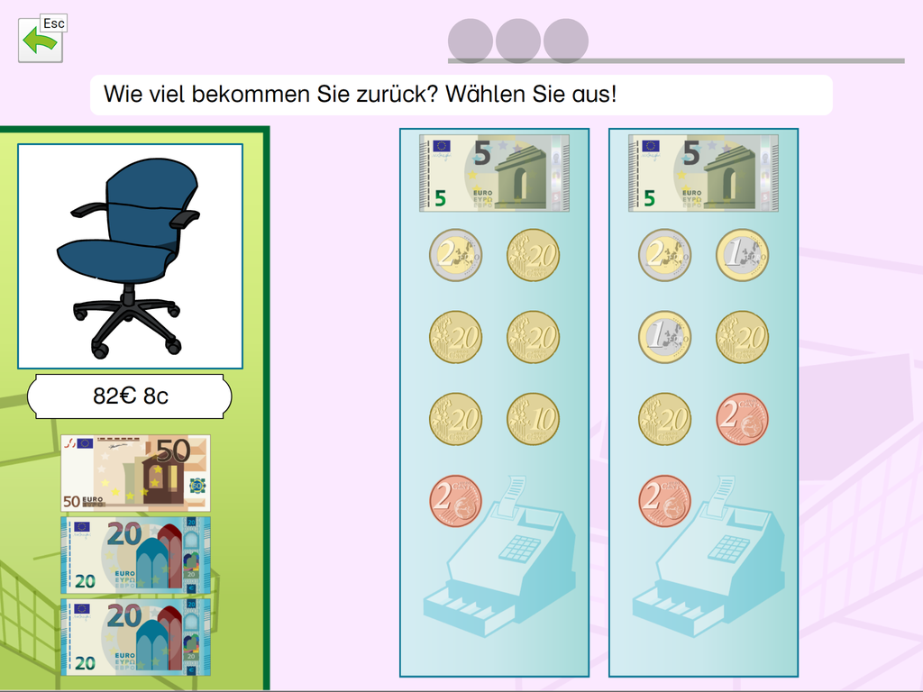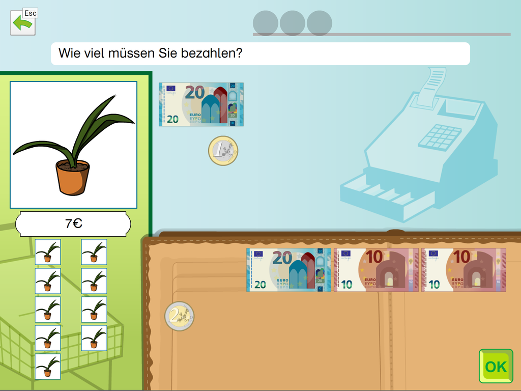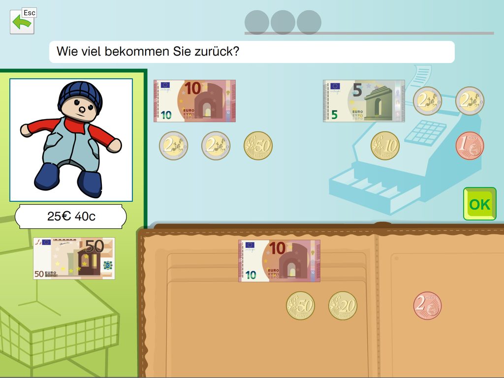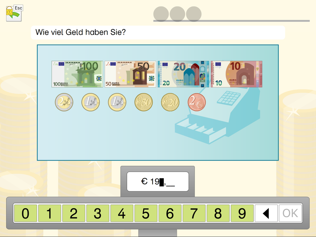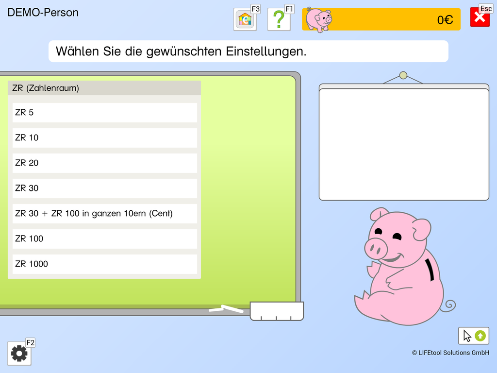 Durch das Lösen von Aufgaben erhält die übende Person virtuelles Geld, das zum Einrichten eines Zimmers verwendet werden kann. Dieses spielerische Belohnungssystem soll das Thema „Sparen“ näherbringen.