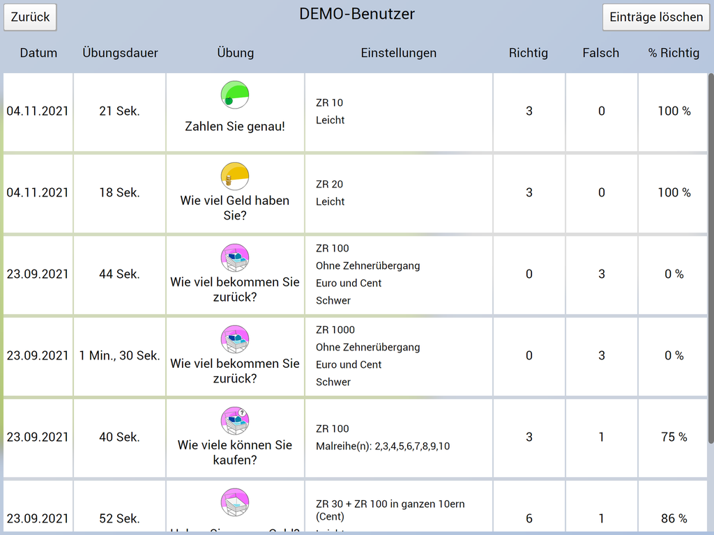 Alle abgeschlossenen Übungen werden protokolliert und so die Überprüfung des Lernfortschritts ermöglicht.