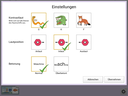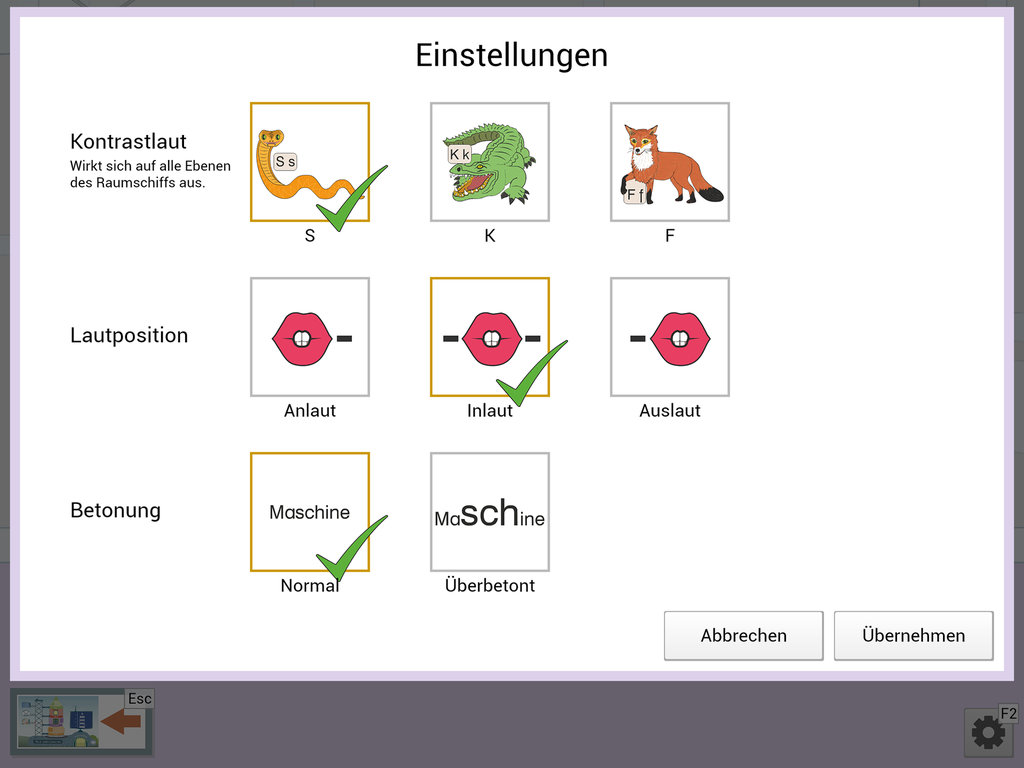 Zusätzliche Einstellungsmöglichkeiten bei den Übungen (Kontrastlaute: neben S zusätzlich auch K und F; Lautposition: Anlaut, Auslaut, Inlaut; Betonung: normale oder starke Betonung).